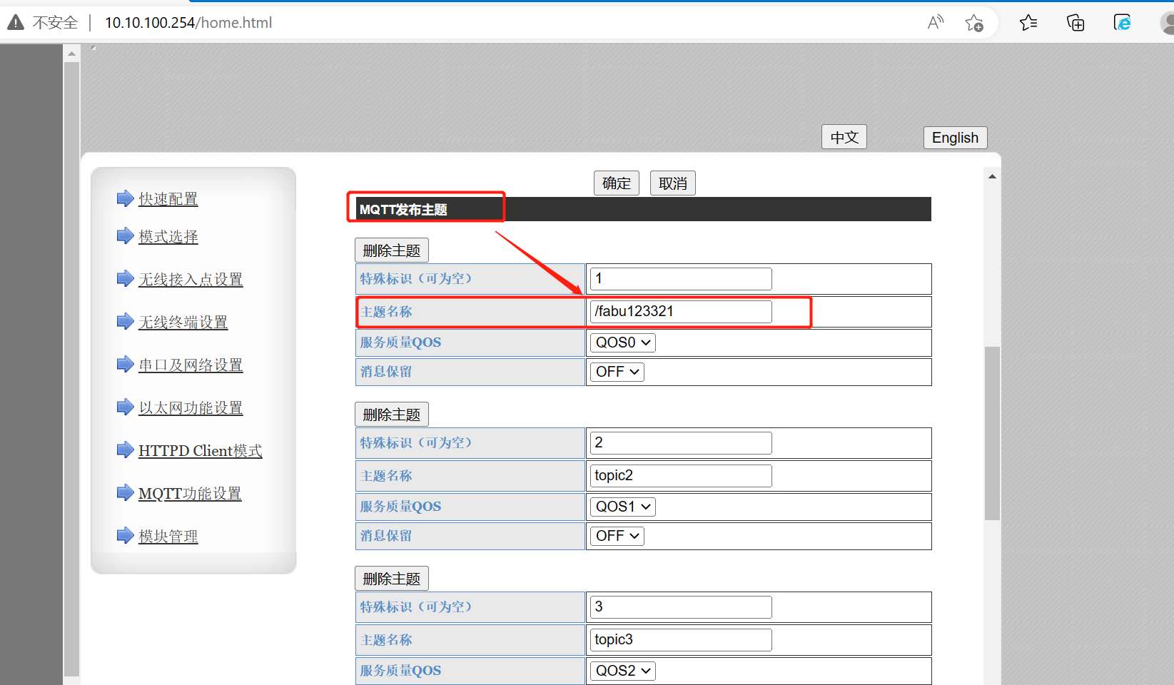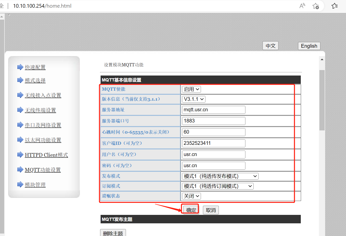 填寫好“訂閱主題”和“發(fā)布主題”后,點(diǎn)擊“確定”并重啟設(shè)備。