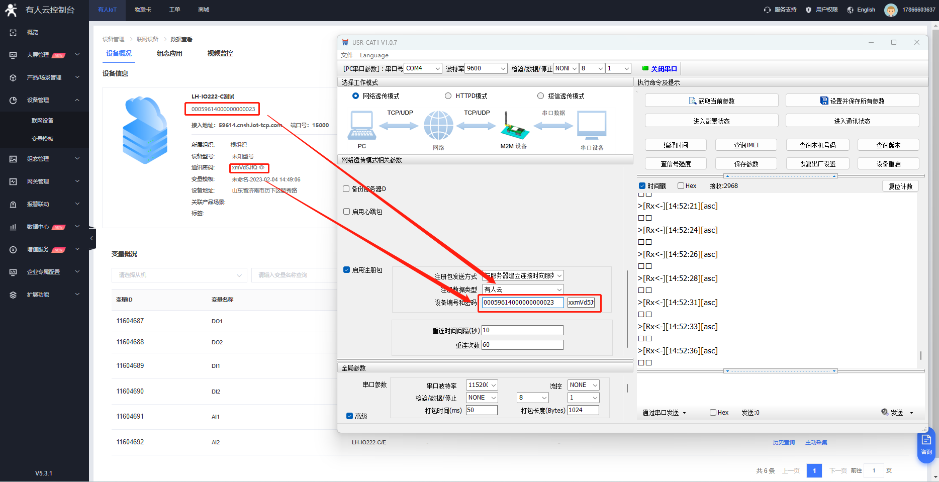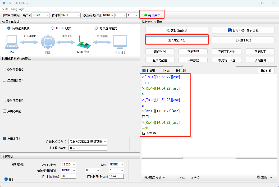 7. 打開(kāi)USR-CAT1軟件,點(diǎn)擊進(jìn)入配置狀態(tài),設(shè)備回復(fù)+++a OK后進(jìn)入配置狀態(tài)—獲取當(dāng)前參數(shù),填入IP地址和端口號(hào)以及注冊(cè)包信息后,--設(shè)置并保存所有參數(shù)—設(shè)備重啟,然后即可看到有人端設(shè)備在線