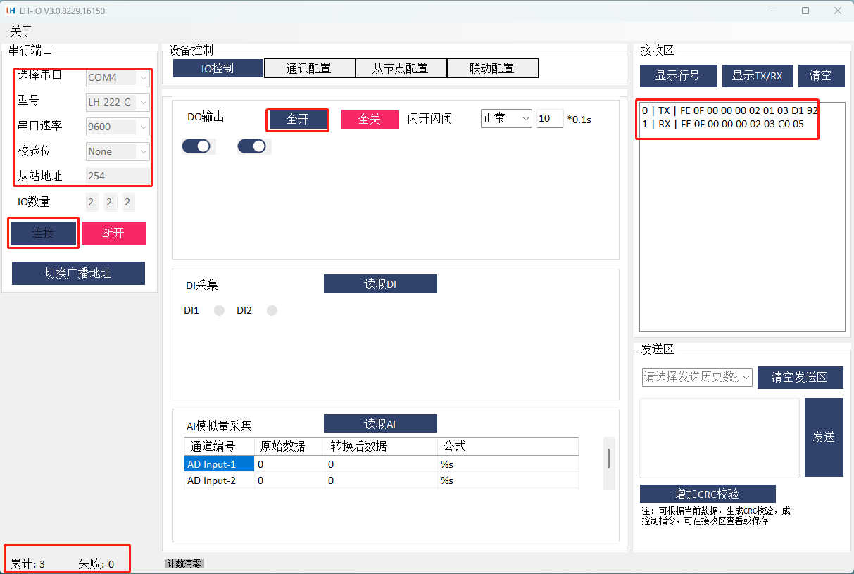 8. 關(guān)閉USR-CAT1軟件,打開(kāi)LH-IO軟件,點(diǎn)擊全開(kāi)全關(guān)測(cè)試能否正常通訊控制DO動(dòng)作