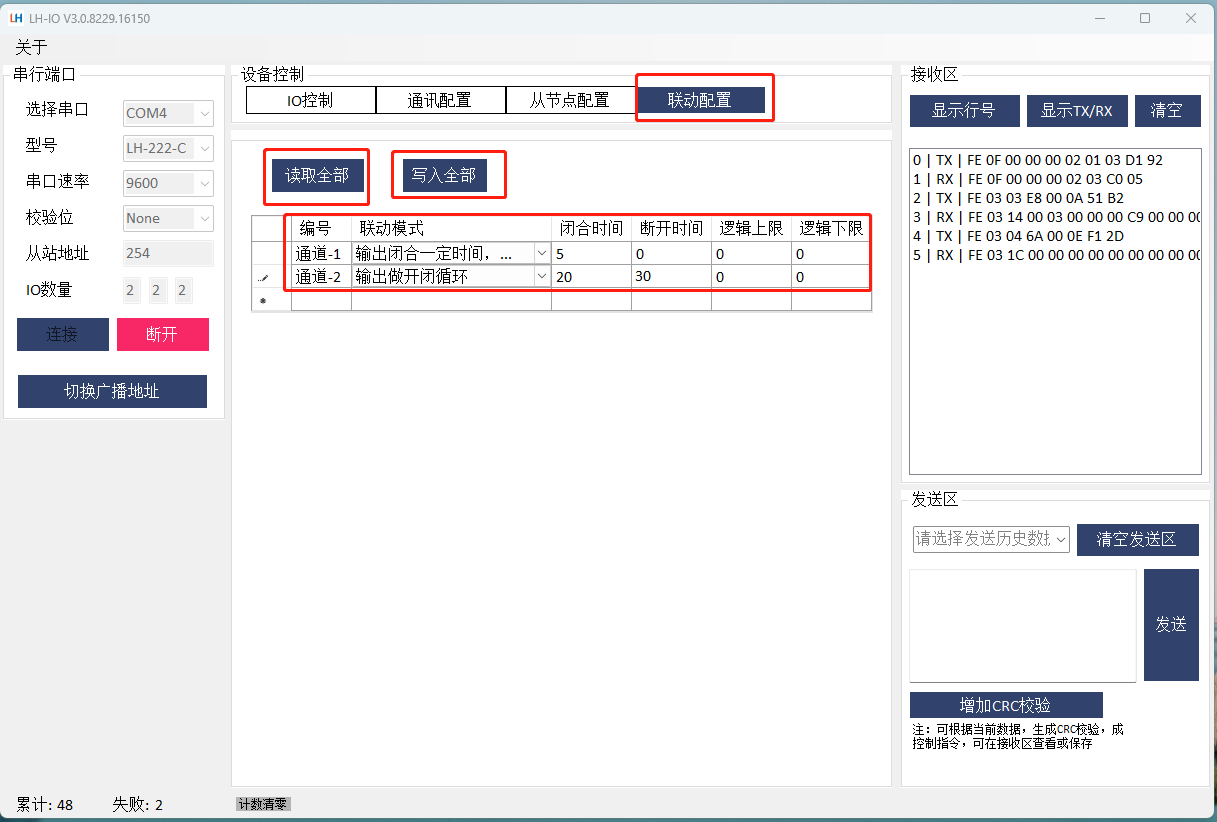 點(diǎn)擊聯(lián)動(dòng)配置,讀取全部,選擇通道1和通道2的工作模式后,點(diǎn)擊寫(xiě)入全部。通道1選擇“輸出閉合一段時(shí)間,然后斷開(kāi)”閉合時(shí)間設(shè)置為5S,通道2選擇“輸出做開(kāi)閉循環(huán)”,閉合時(shí)間為20S,斷開(kāi)時(shí)間為30S.