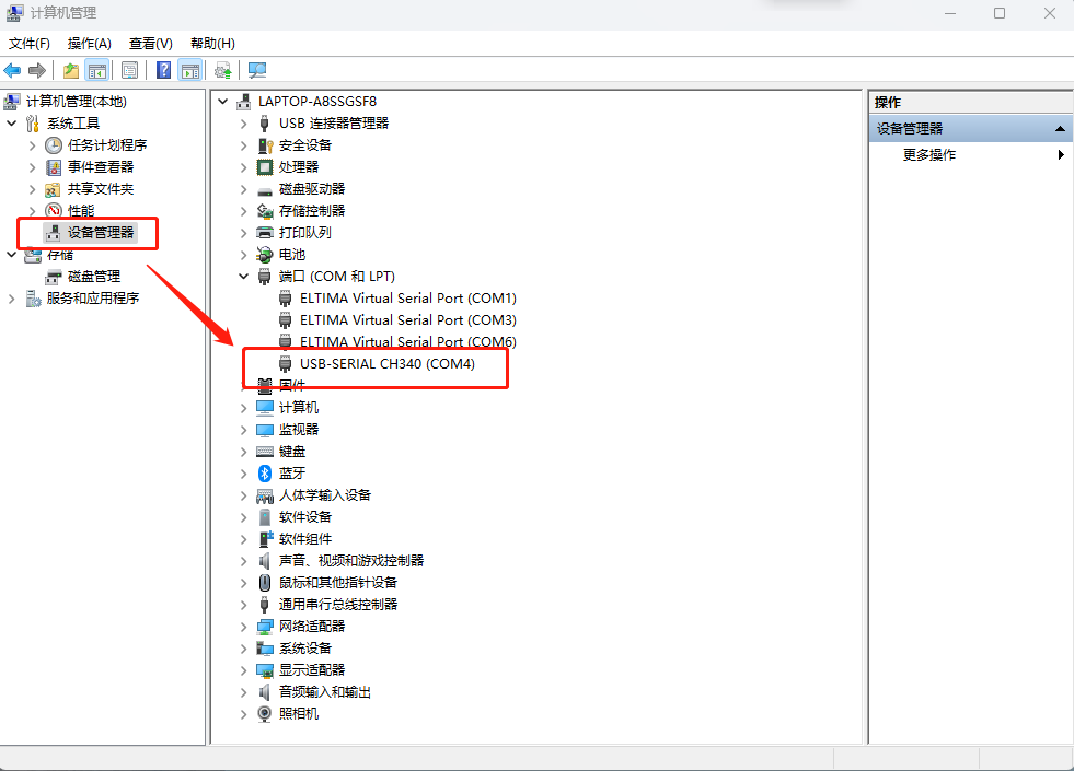6. 使用USB轉(zhuǎn)485轉(zhuǎn)換器鏈接電腦和LH-IO222-C,給LH-IO222-C供12V1A的直流電,電腦打開(kāi)控制面板-設(shè)備管理器查看當(dāng)前COM序號(hào)及驅(qū)動(dòng)是否正常,如圖所示COM4