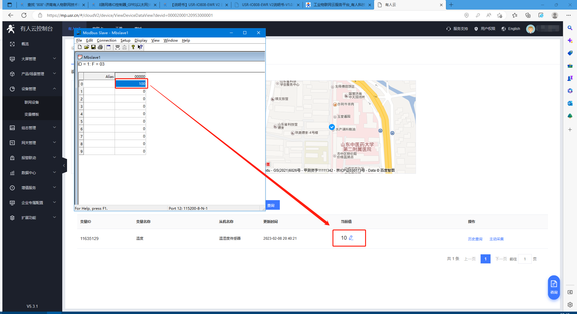 云端下發采集指令,modbus slave模擬串口設備上傳數據