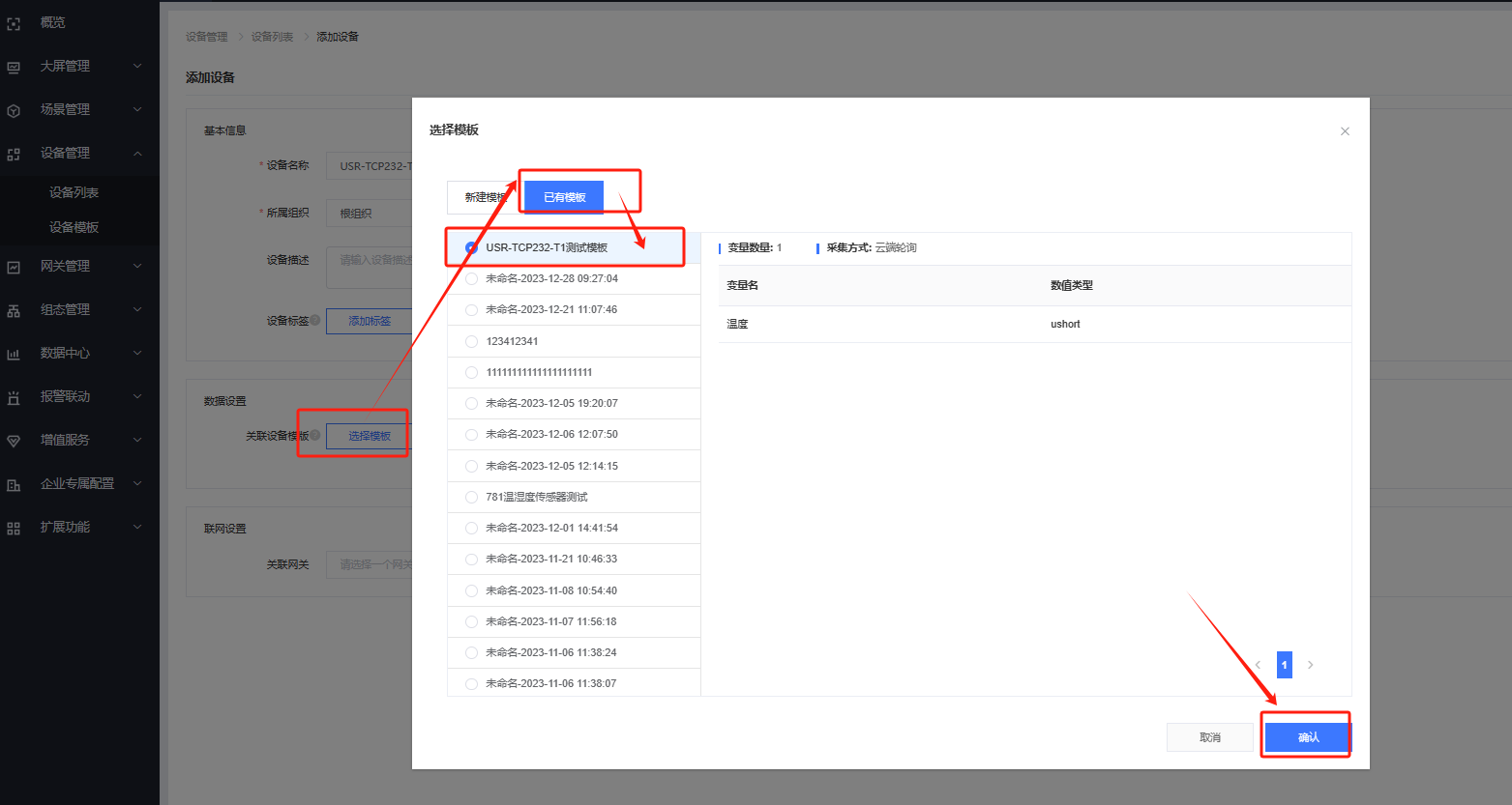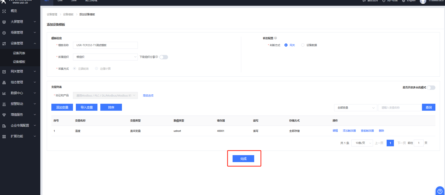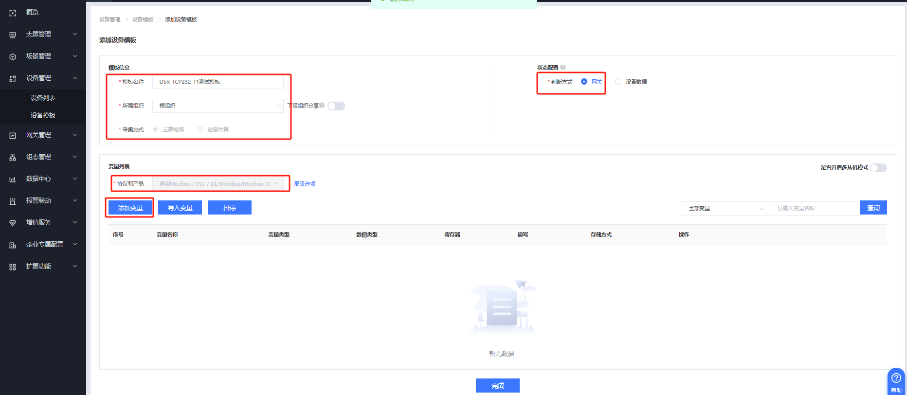 模板名稱可自定義,所屬組織選擇根組織,采集方式選擇云端輪詢,判斷方式選擇網關