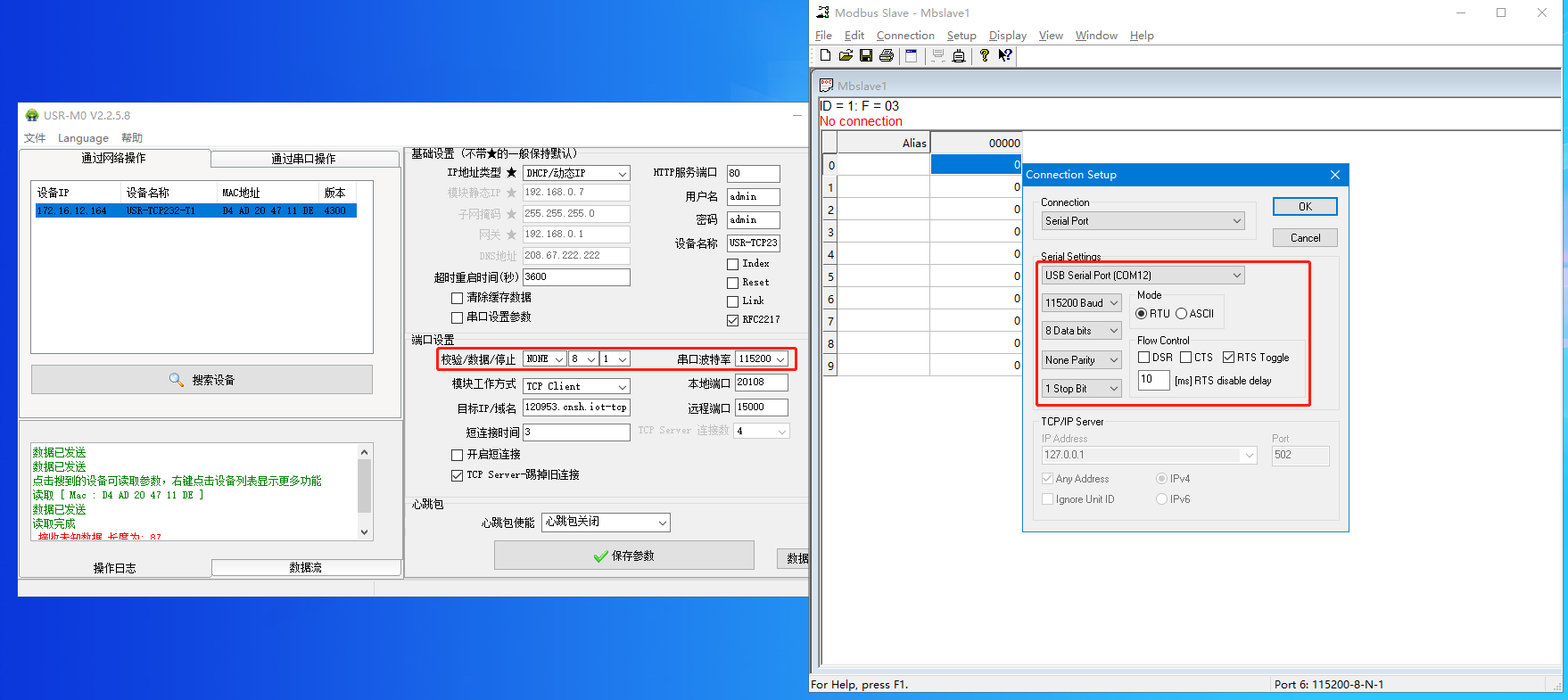 四、Modbus slave軟件模擬串口設備,串口參數設置一致