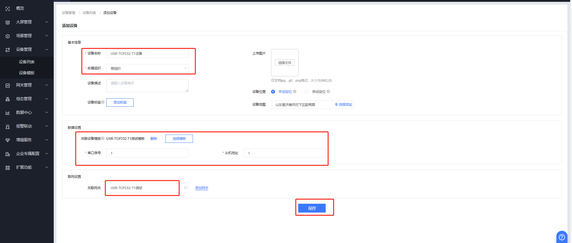 設備名稱可自定義,所屬組織選擇根組織,T1目前不支持SN碼添加,點擊右側“沒有SN,點這里”,設備ID和通訊密碼可以自動生成,設備ID20位,通訊密碼必須是8位(支持修改密碼)。設置完成后點擊保存即可看到平臺給分配的接入地址和SN 密碼等信息。