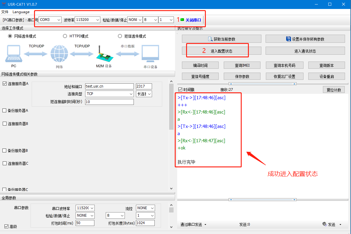打開串口后,先點擊進入配置狀態,如果模塊能返回+ok的字符,說明電腦和模塊連接是沒有問題的;然后點擊進入通訊狀態,做數據通訊測試。