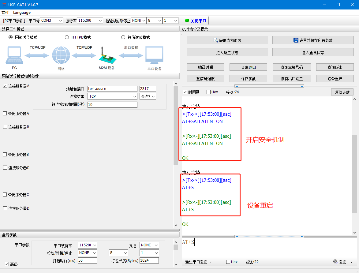 2.在串口發送AT指令開啟安全機制(AT指令后要加回車,或者點擊軟件發送按鈕小三角選擇AT指令自動加回車)