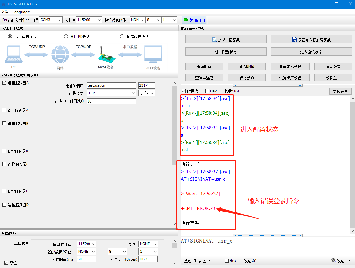 如果輸入登錄指令錯誤會返回+CME ERROR:73如圖所示