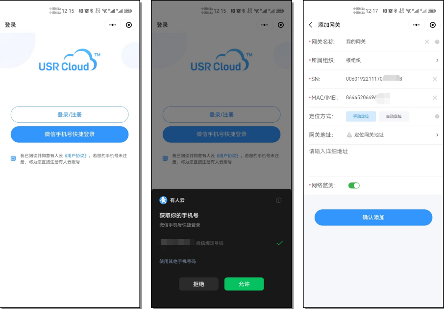 1.微信注冊登錄 如果未曾注冊過有人通行證,可以直接勾選“我已閱讀并同意《用戶協(xié)議》”并點擊“微信手機號快捷登錄”,彈窗同意小程序獲取 手機號權(quán)限之后,若當前手機號未注冊有人通行證,則將為您直接注冊有人云賬號。注冊登錄成功之后即可配置網(wǎng)關(guān)添加