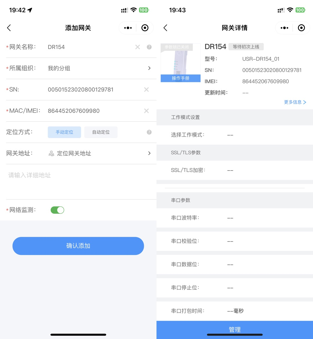 如上章節(jié)跳轉(zhuǎn)至設(shè)備添加界面之后,自定義網(wǎng)關(guān)名稱,選擇網(wǎng)關(guān)所屬組織,點擊確認添加。稍等片刻或者給 DTU 重新上電后即可顯 示網(wǎng)關(guān)設(shè)備在線,網(wǎng)關(guān)在線后即可對網(wǎng)關(guān)進行參數(shù)鎖、重啟、恢復(fù)出廠、參數(shù)配置等操作