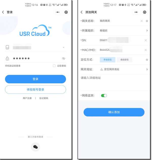 2.賬號密碼登錄 如果不想使用微信快捷登錄,也可以點擊“注冊/登錄”,掃碼跳轉(zhuǎn)后直接輸入用戶名密碼登錄后即可配置網(wǎng)關(guān)添加(如果微信小程序已經(jīng)登錄賬號,掃碼后會直接跳轉(zhuǎn)至設(shè)備添加頁面)。