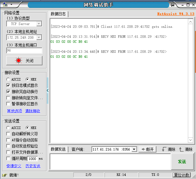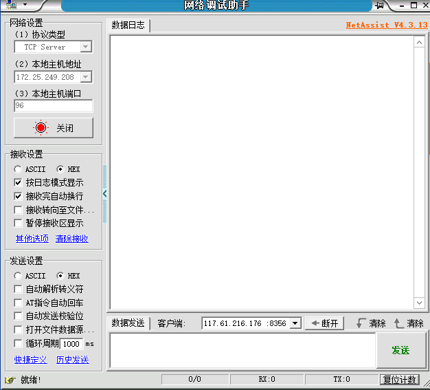 4、如果使用AT+SOCKALK顯示已經(jīng)連接而對方服務(wù)器沒有接收到的話,可以嘗試使用網(wǎng)絡(luò)端調(diào)試連接測試服務(wù)器
