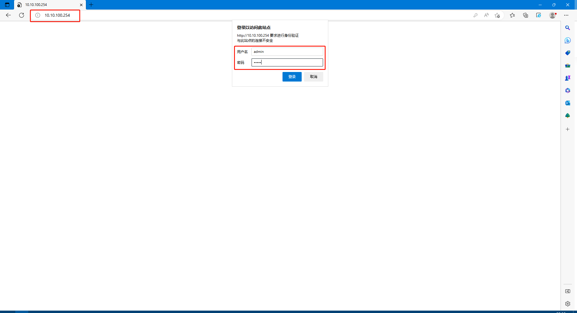 3、電腦打開W630的內(nèi)置網(wǎng)頁:瀏覽器輸入10.10.100.254,用戶名/密碼:admin/admin