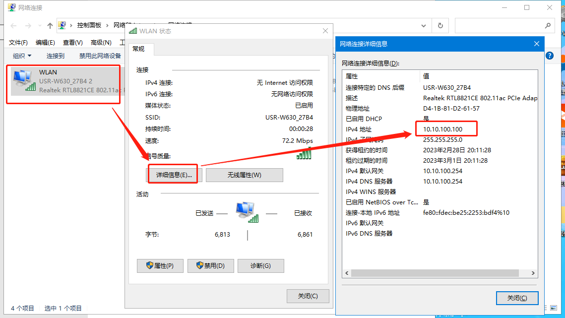 2、電腦連接W630的wifi,連接成功后,電腦會獲取到10.10.100.xx網(wǎng)段的IP地址