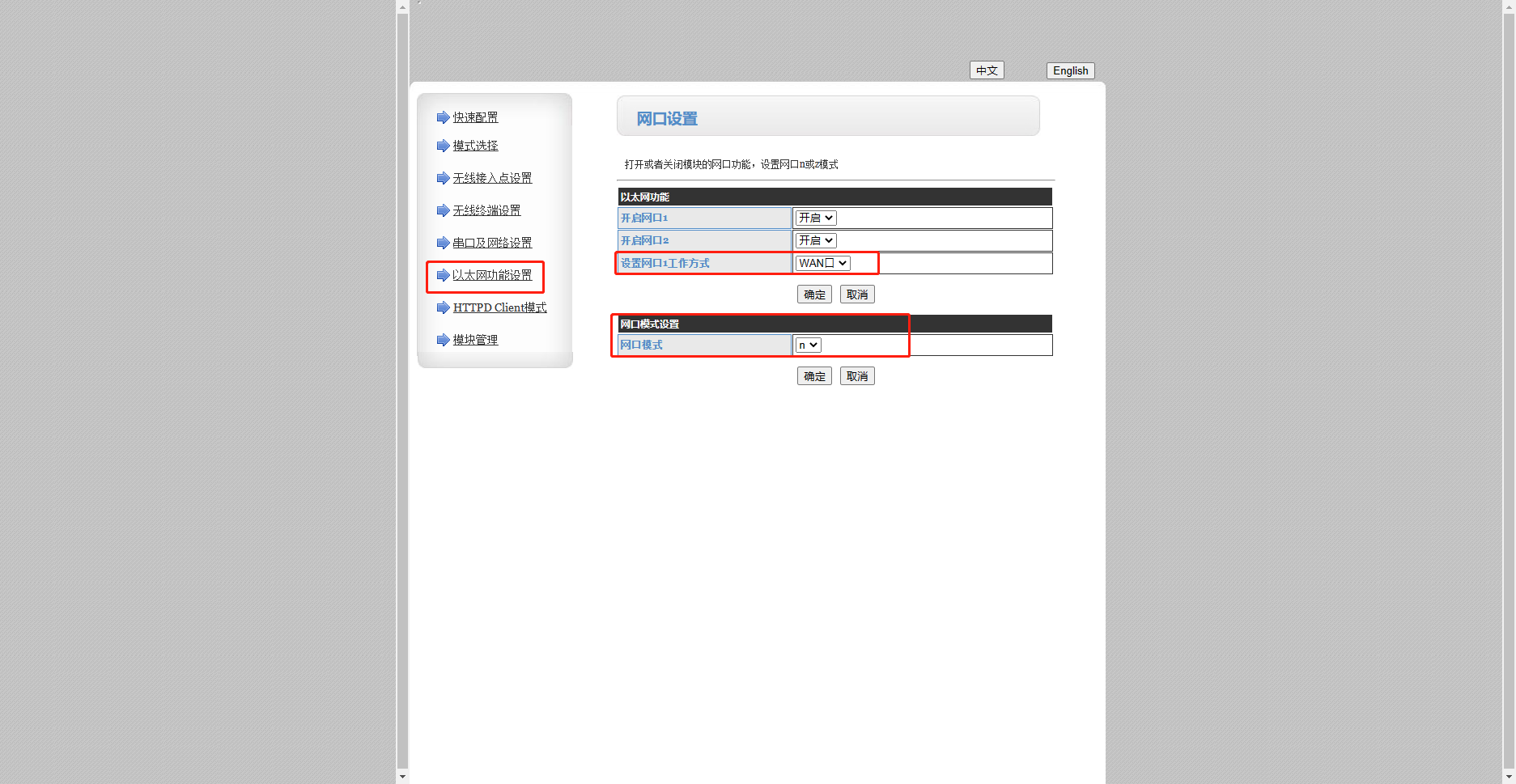 4、以太網(wǎng)功能設(shè)置,設(shè)置網(wǎng)口工作方式wan口,網(wǎng)口模式n所有參數(shù)設(shè)置完成后重啟
