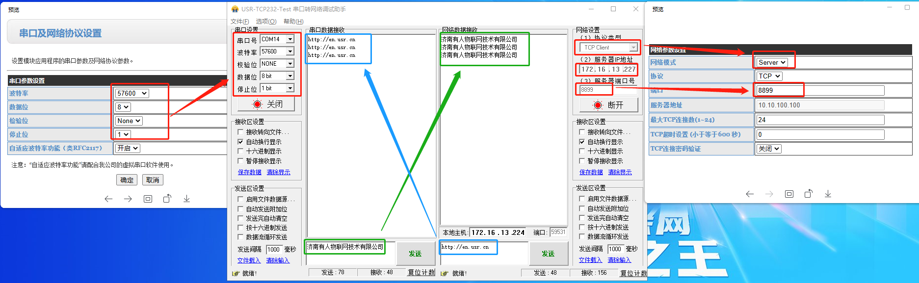 實際測試中調(diào)試助手的網(wǎng)絡(luò)端和串口端互發(fā)數(shù)據(jù)不通可參考五章節(jié)附件4排查