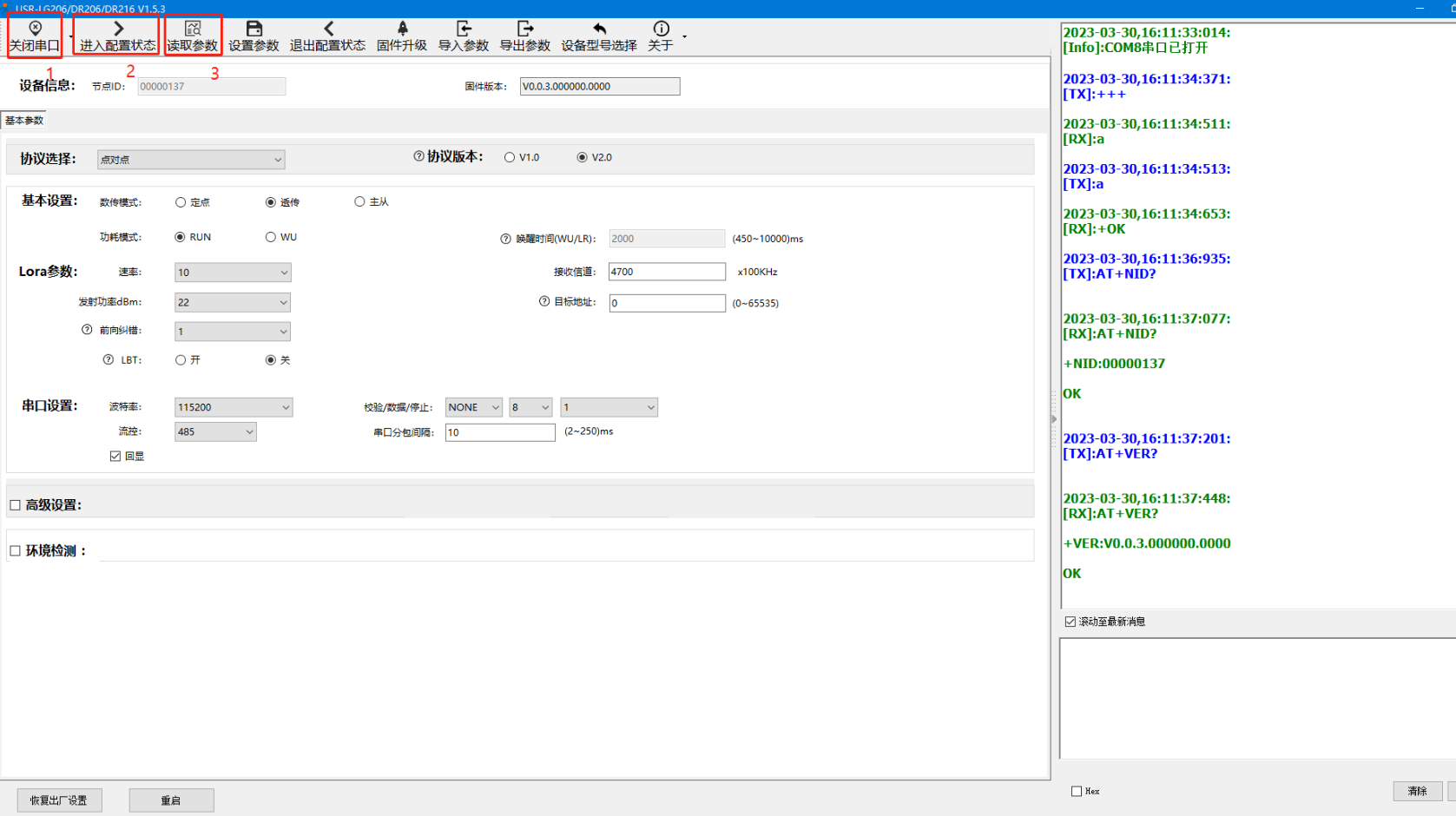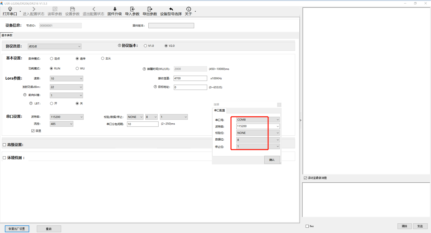 然后選擇DR206的默認參數:115200;N;8;1