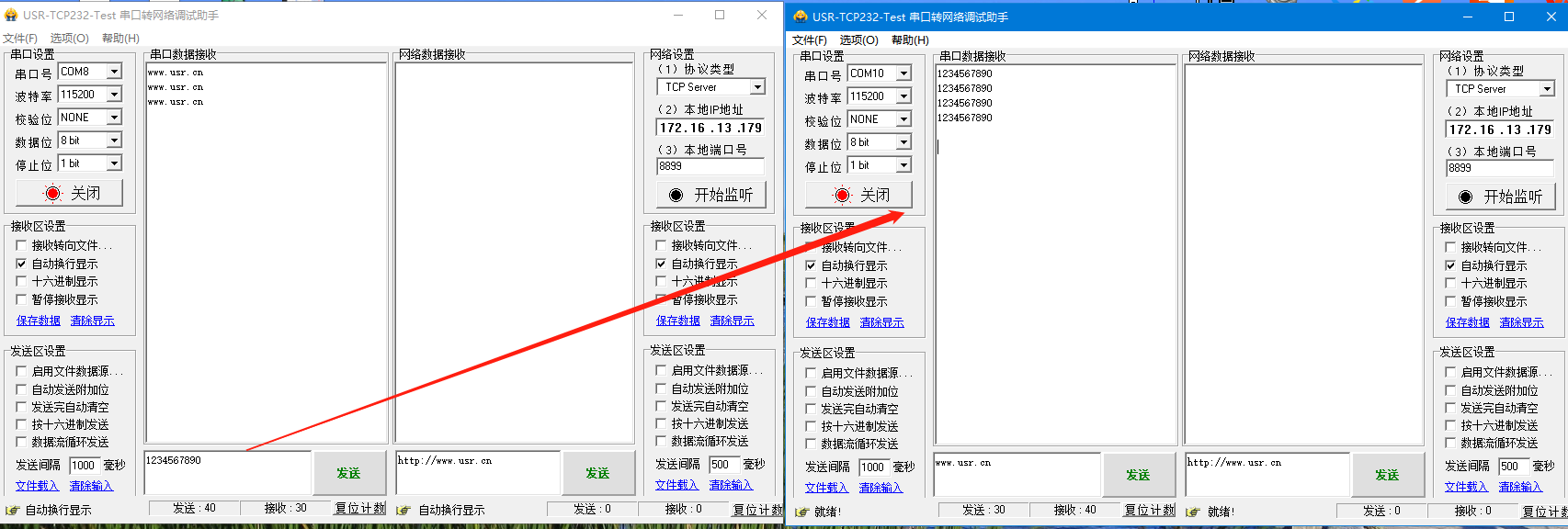 分別打開2個串口調試助手,并選擇正確的串口參數,115200,N,8,1,互發數據測試。