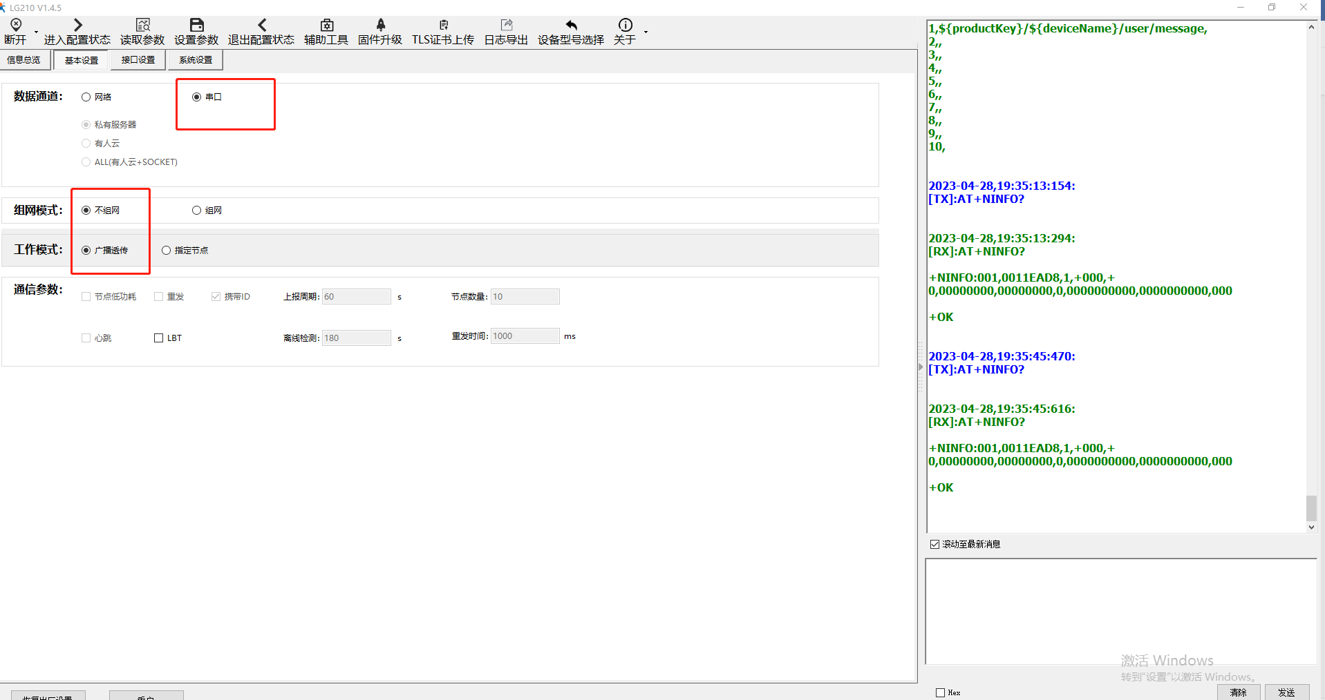 設(shè)置【基本設(shè)置】:數(shù)據(jù)通道--串口、不組網(wǎng)、廣播透?jìng)髂J?/p>