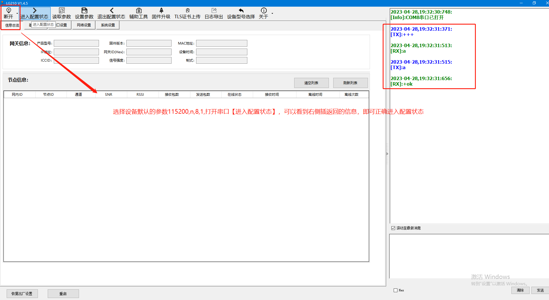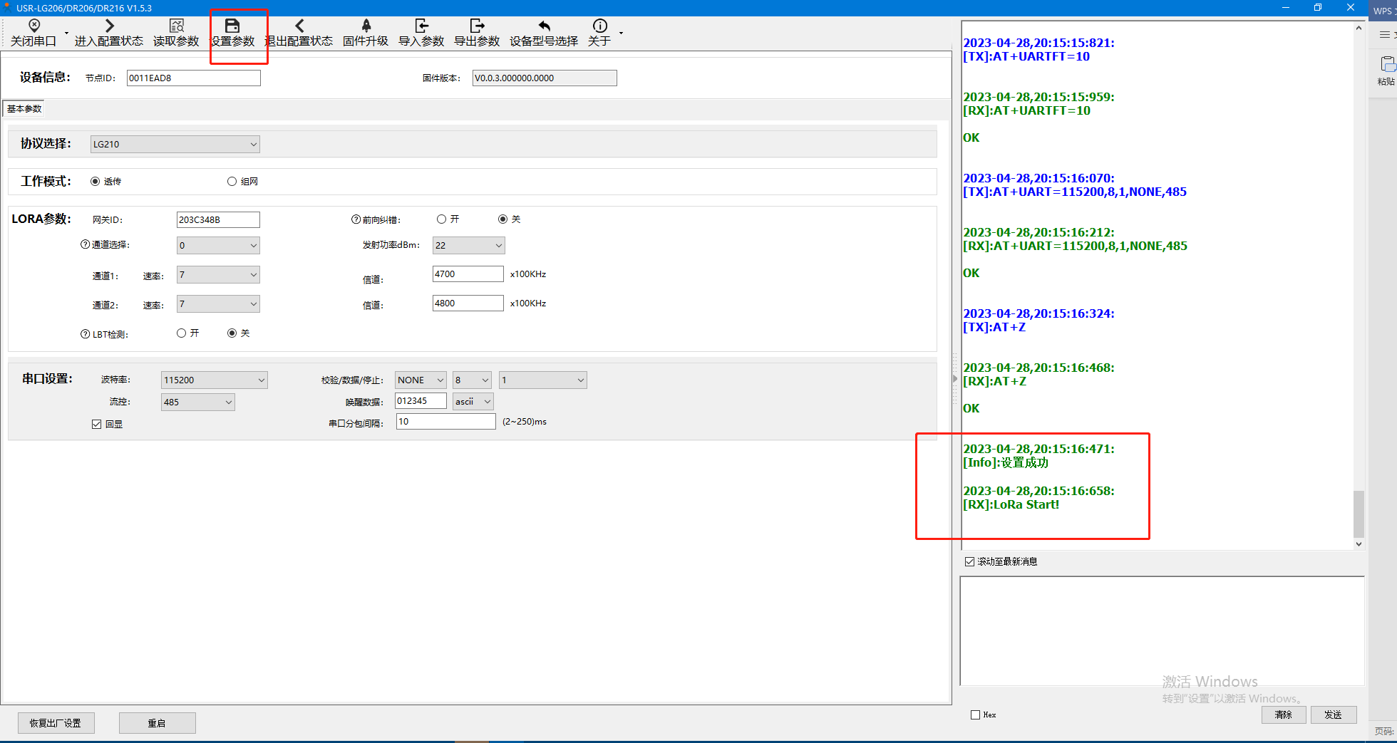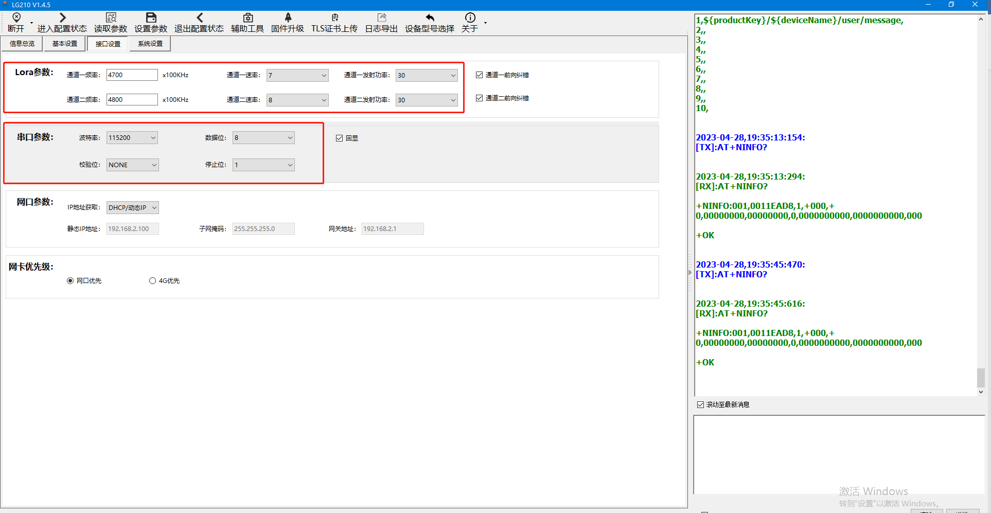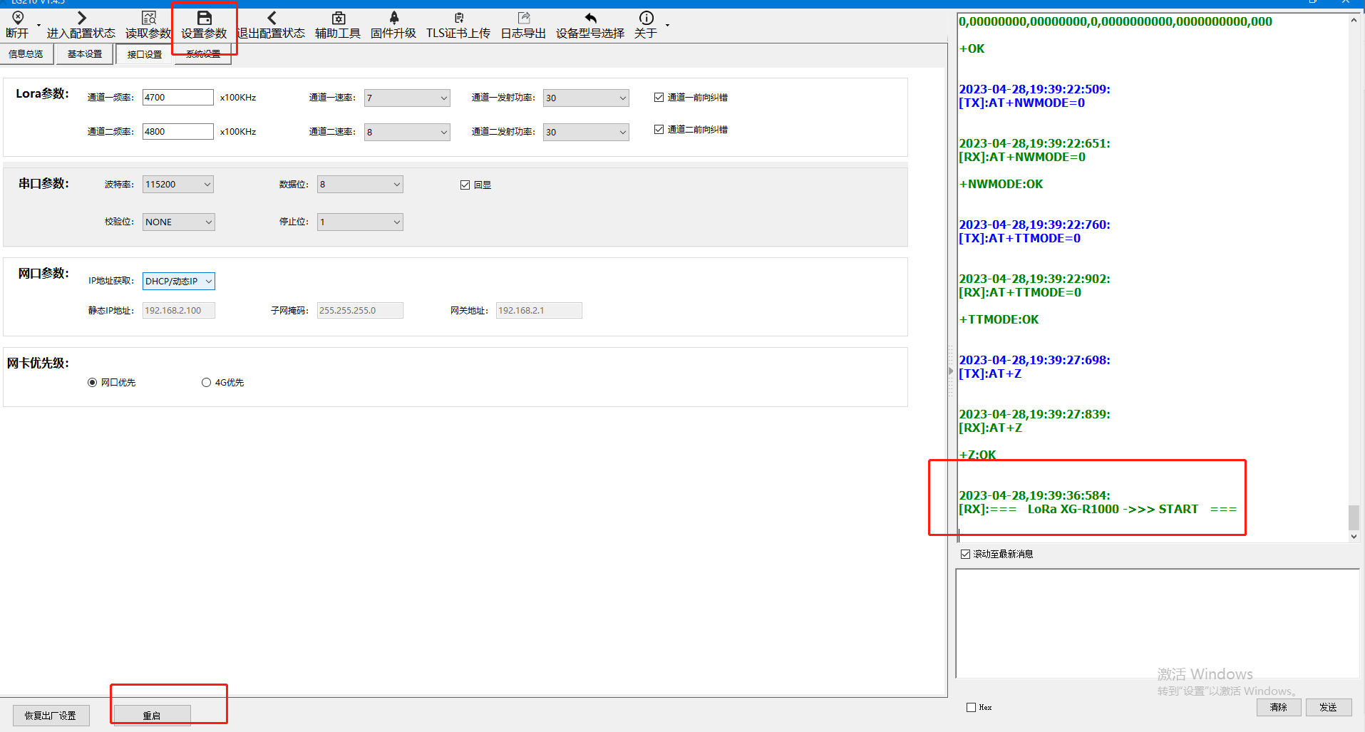 點(diǎn)擊【設(shè)置參數(shù)】重啟設(shè)備,可以看到LG210重啟成功的打印信息。