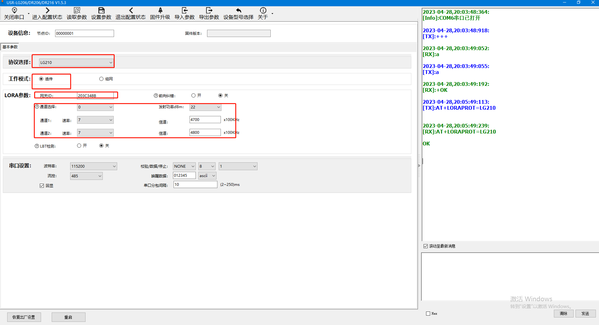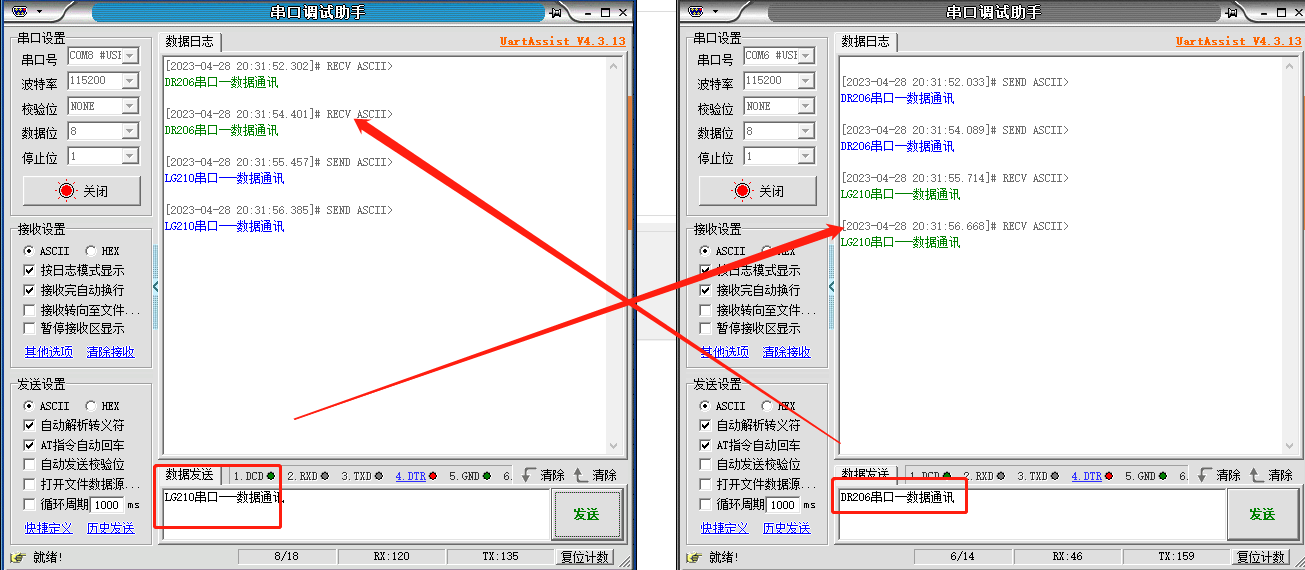 打開(kāi)兩個(gè)串口調(diào)試助手,一個(gè)是LG210的串口-模擬上位機(jī),一個(gè)是DR206的串口--模擬終端設(shè)備,測(cè)試節(jié)點(diǎn)和網(wǎng)關(guān)之間的串口廣播通訊。