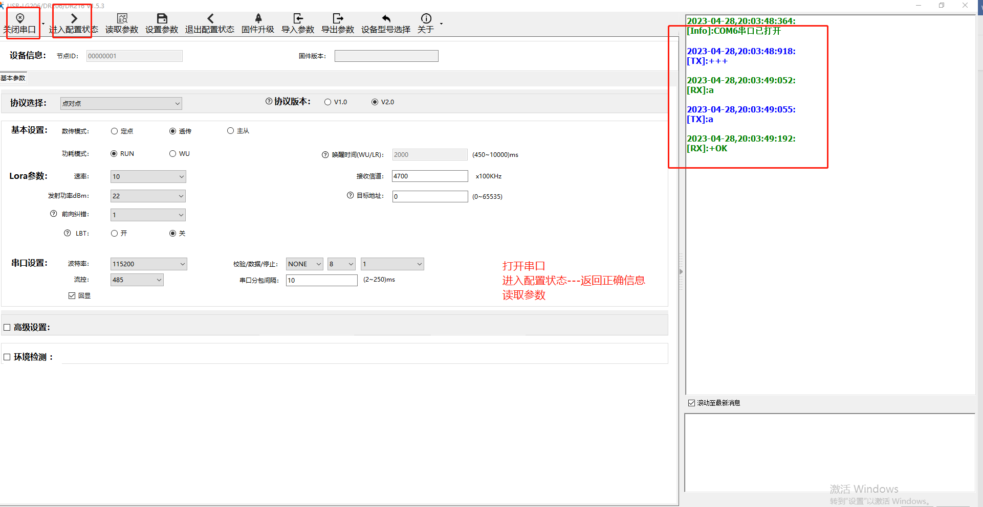 打開(kāi)串口--進(jìn)入配置狀態(tài)(返回a+ok)--讀取參數(shù)