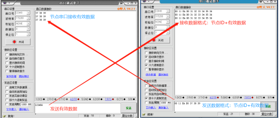 電腦打開(kāi)2個(gè)串口調(diào)試助手軟件,打開(kāi)對(duì)應(yīng)USR-DR206和USR-LG210的USB-RS232/485串口線COM口號(hào),USR-LG210串口發(fā)送16進(jìn)制的數(shù)據(jù)(數(shù)據(jù)格式:節(jié)點(diǎn)ID+有效數(shù)據(jù)),有效數(shù)據(jù)透?jìng)鹘oDR206串口。DR206串口發(fā)送ascii數(shù)據(jù),數(shù)據(jù)傳輸給LG210串口,接收數(shù)據(jù)以十六進(jìn)制顯示(數(shù)據(jù)格式為:16進(jìn)制節(jié)點(diǎn)ID+有效數(shù)據(jù))