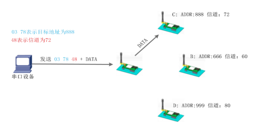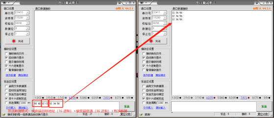 電腦打開2個串口調試助手軟件,打開兩個模塊對應的USB-RS232/485串口線COM口號,發送端模塊串口發送16進制的數據(數據格式:接收端目標地址(16進制)+接收端信道(16進制)+有效數據),有效數據透傳給接收端串口。