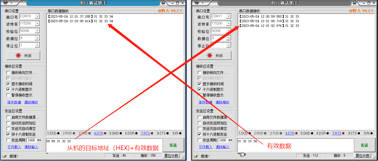 電腦打開2個串口調試助手軟件,打開兩個模塊對應的USB-RS232/485串口線COM口號,主機端模塊串口發送16進制的數據(數據格式:從機端目標地址(HEX)有效數據),有效數據透傳給接收端串口。從機端可以直接給主機端模塊發送有效數據。
