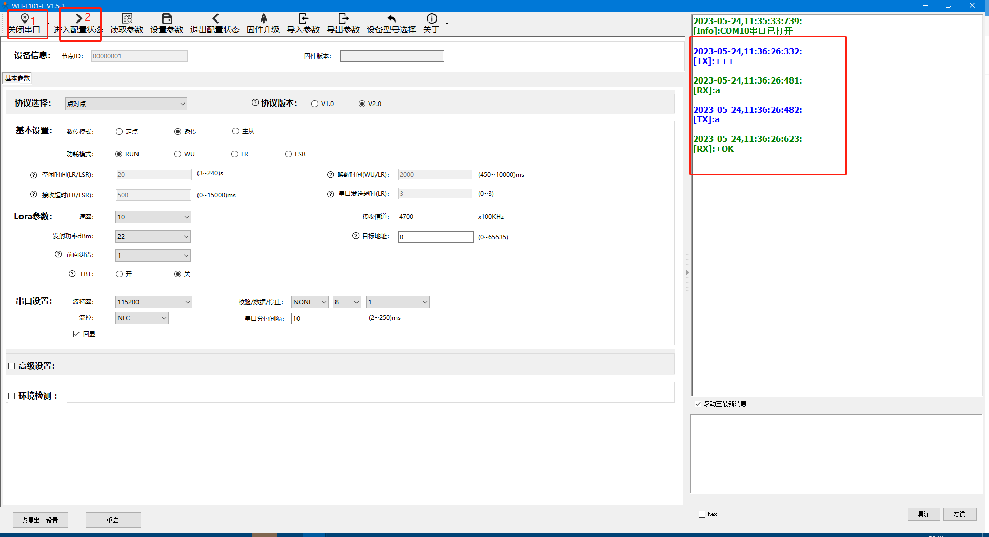 1、電腦下載并安裝WH-L101-L的設置軟件,選擇對應的產品型號打開軟件。選擇對應串口com10、com11,使用產品默認的串口參數(115200 N 8 1)打開,點擊進入配置狀態(返回a+ok說明成功進入配置)然后讀取參數。