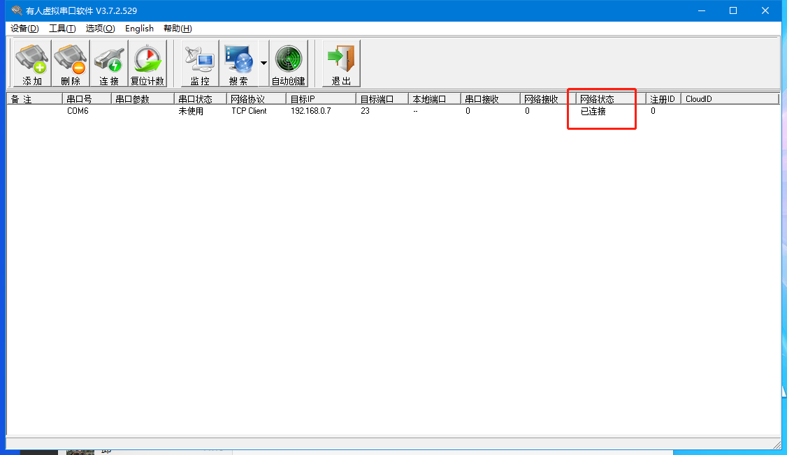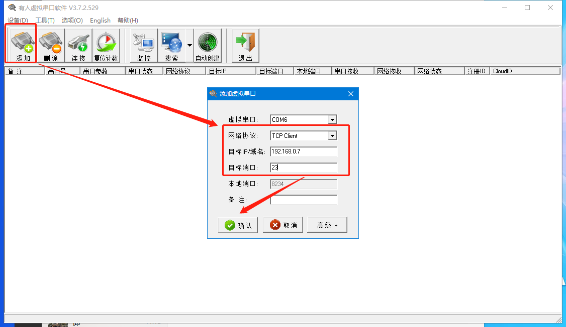(1) 打開虛擬串口,設置點擊添加串口,選擇串口號為 COM6(選擇 COM 號一定要避開已經存在的 COM 口) 網絡協議選擇 TCP Client,目標域名/IP 設置成T1的IP,目標端口號設置為 T1的端口號,備注填寫自己的設備名稱
