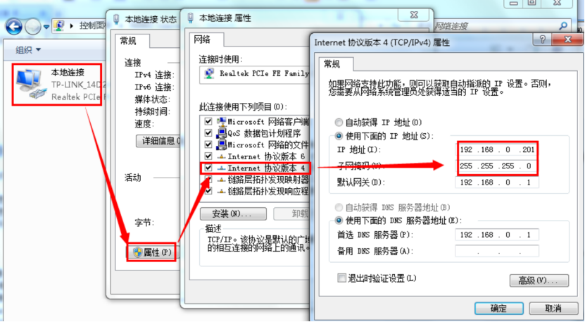 1)電腦本地連接,IP設置和T1模塊IP同網段,T1默認IP是192.168.0.7,網關192.168.0.1,電腦本地連接IPv4設置靜態IP,192.168.0.201,子網掩碼255.255.255.0,網關192.168.0.1。