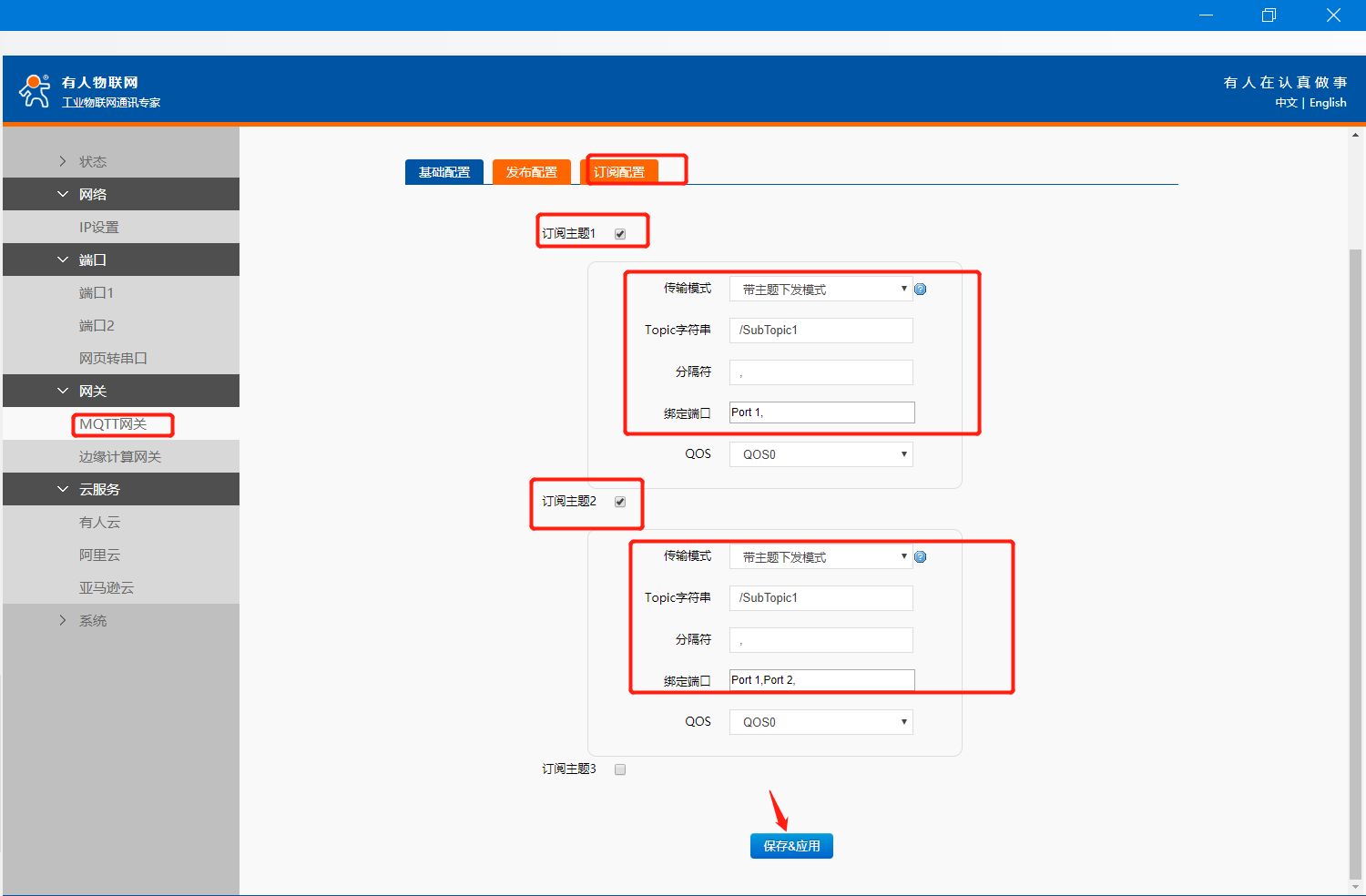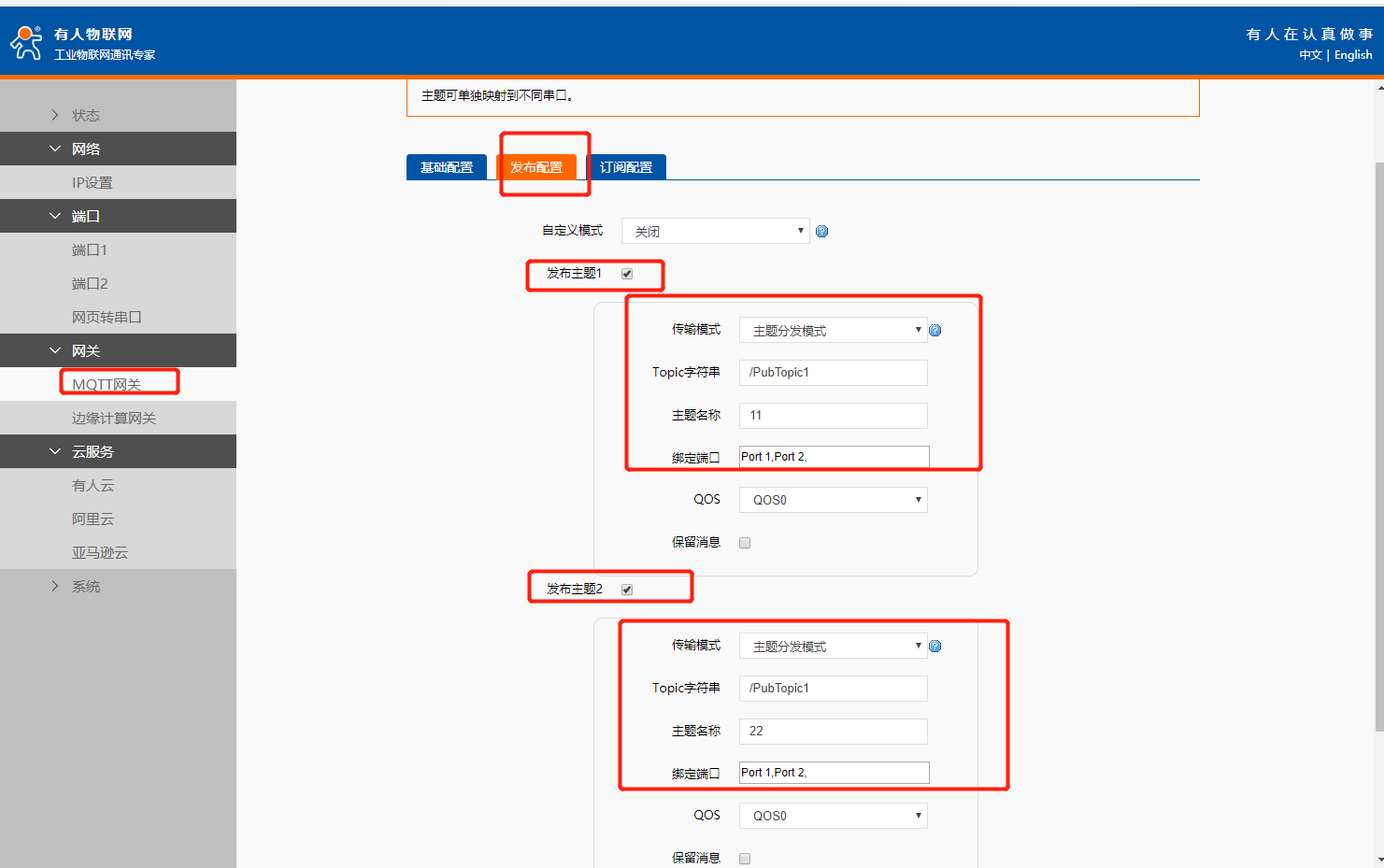 4、開啟MQTT使能,配置MQTT服務器參數,并配置發布主題和訂閱主題,注意:主題名稱設置不同。