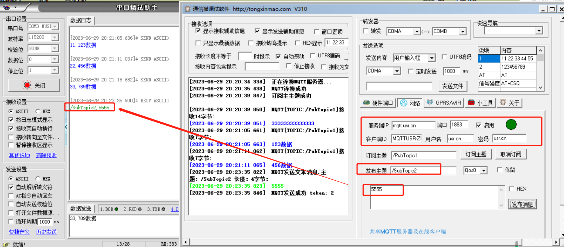 例如:發布主題開啟多主題分發,主題標識設置為 11,串口發送 11,123數據,數據將發送到MQTT客戶端軟件上。如果串口發送 33,789數據,則數據將會被丟棄,因為沒有主題名稱標識為 33 的主題