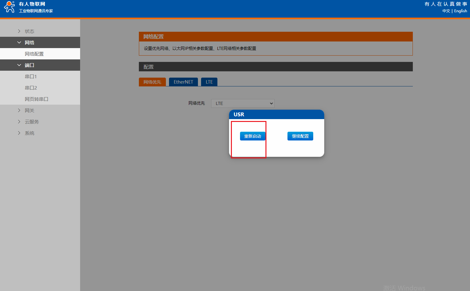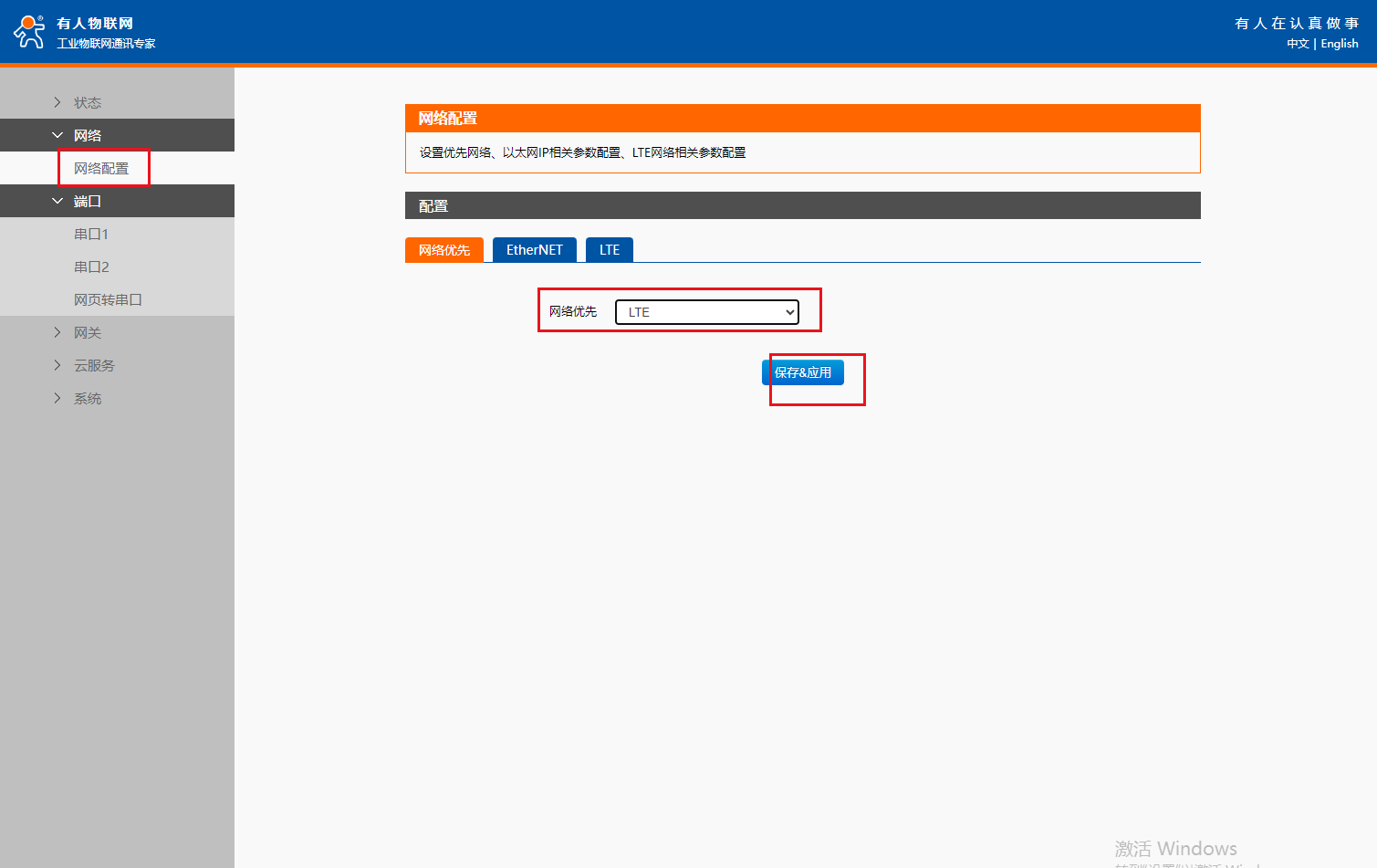 (6)網絡配置: 以太網接入網線通信,用于局域網時,因為不能接入公網,M100 將以太網判定為無網絡連接,當設定為以太網優先模式時,設備會進行 Cat1 網絡的連接,連接成功后在狀態界面顯示當前運行網絡為 LTE Cat1。但此顯示并不影響以太網的局域網通信能力 ,所以網絡優先級選擇LTE.保存重啟參數生效。