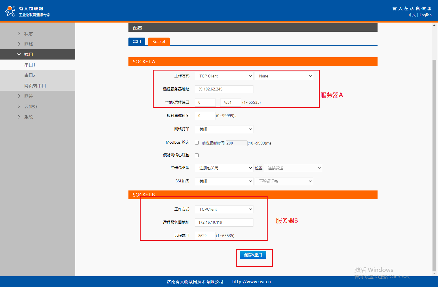 (5) 設置socketA工作方式選擇TCP Client,目標IP:39.102.62.245(客戶想要連接的服務器的IP地址),遠程端口號:7531(根據客戶的服務器地址填寫),設置socketB工作方式選擇tcp client,目標IP:172.16.10.119,遠程端口號:8520,設置完成后點擊端口1設置保存參數,繼續配置