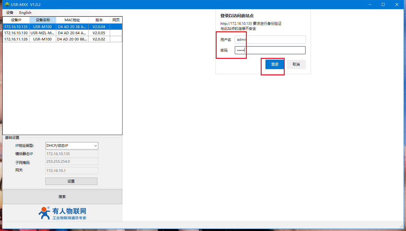 (4)重新搜索到動態獲取IP的M100,輸入內置網頁賬號密碼 admin admin