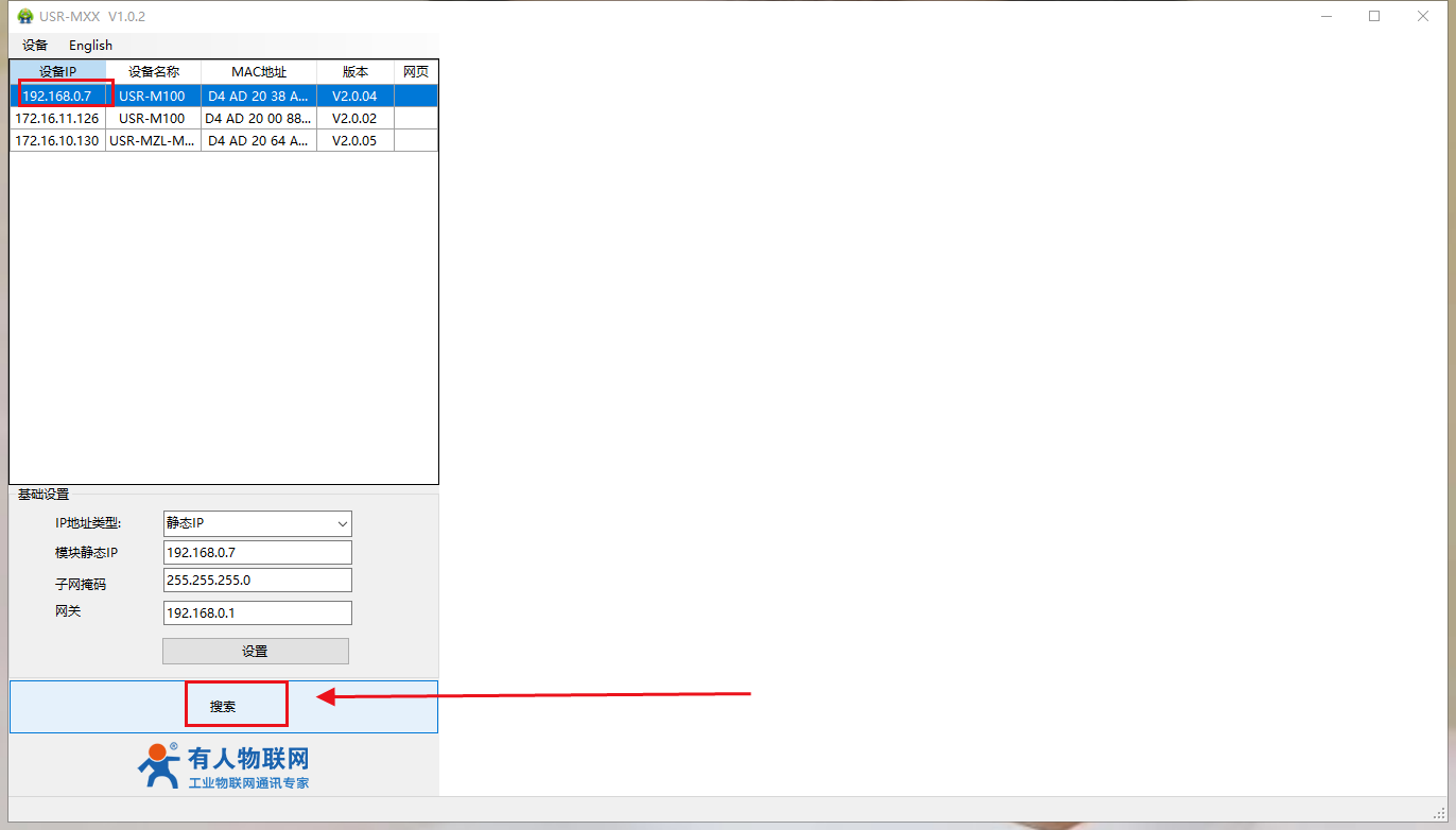 (3)打開M100的配置軟件,點擊搜索,搜索到M100,默認IP是192.168.0.7,雙擊設備IP,然后將IP地址類型改為DHCP/動態IP。點擊設置。