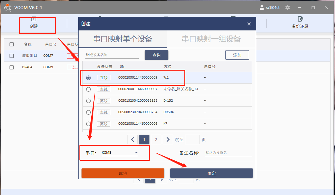 創建一個虛擬串口綁定網關7s1,定義一個串口號。