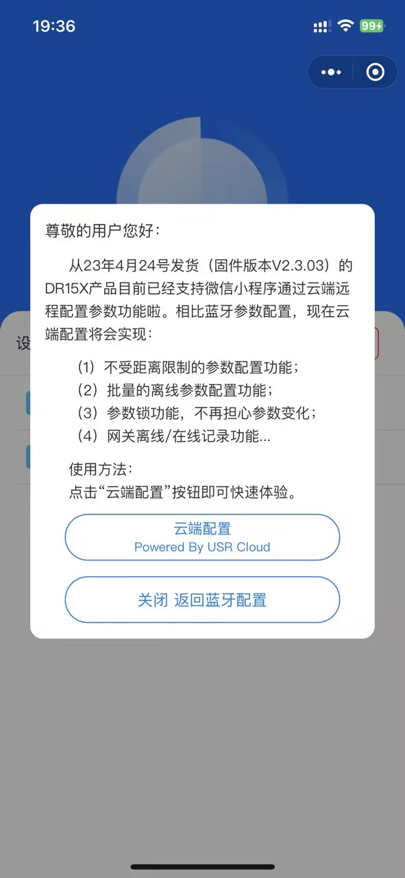DTU 外殼正面貼有設備專屬二維碼,手機微信掃描該二維碼即可跳轉有人云手機端微信小程序登錄添加網(wǎng)關設備。有人云手機端微 信小程序介紹可以參考說明:http://cloud.usr.cn/document/334.htm