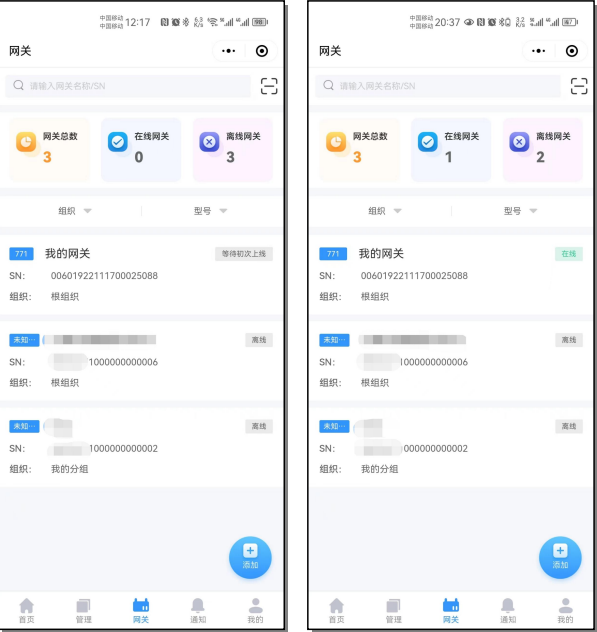 在網(wǎng)關管理---網(wǎng)關列表可以看到我們掃碼添加的兩臺G771設備,如果設備目前處于離線狀態(tài),可以檢查一下設備自身是否可以正常聯(lián)網(wǎng)。在設備正常聯(lián)網(wǎng)狀態(tài)下可以重啟下設備,可以看到設備的在線信息。