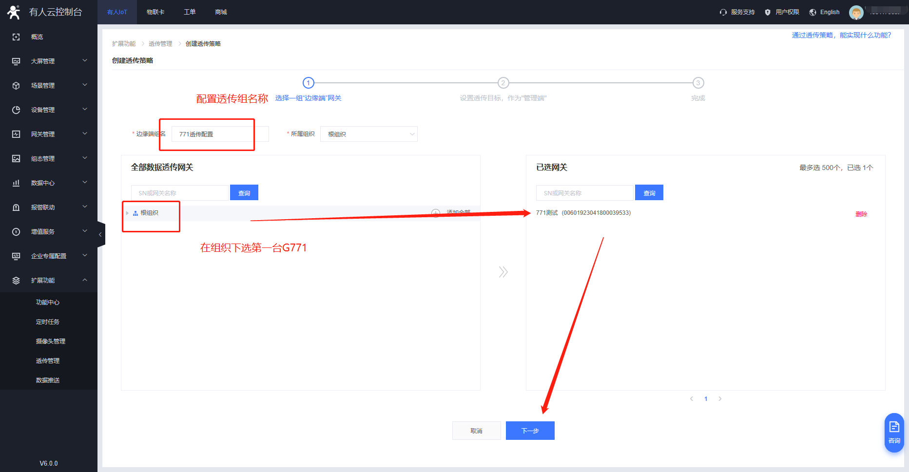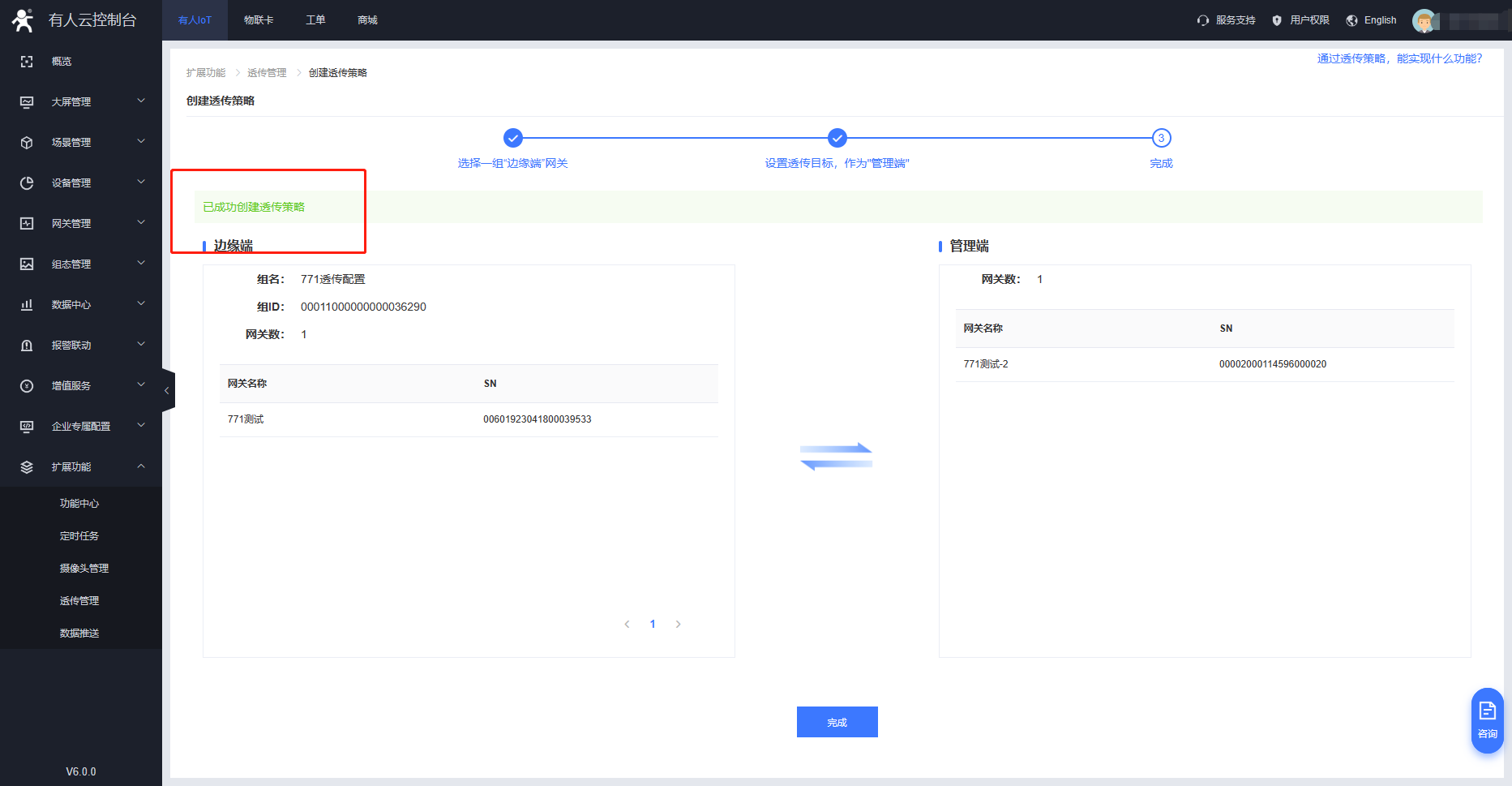 3、在云平臺擴展功能開啟透傳管理的功能。在云端創(chuàng)建數(shù)據(jù)透傳組將兩臺G771進行關聯(lián)。