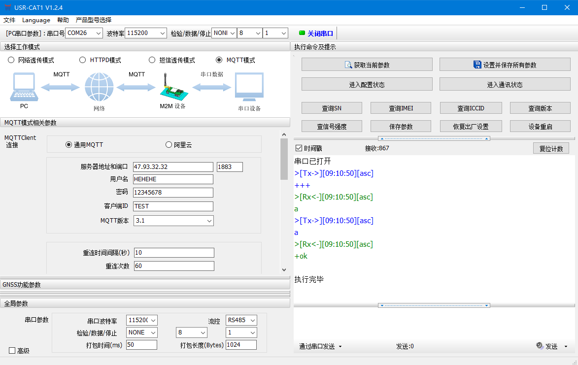1.按照出廠默認的波特率(115200,N,8,1)打開電腦識別的COM口,點擊進入配置狀態(tài),獲取參數(shù)。
