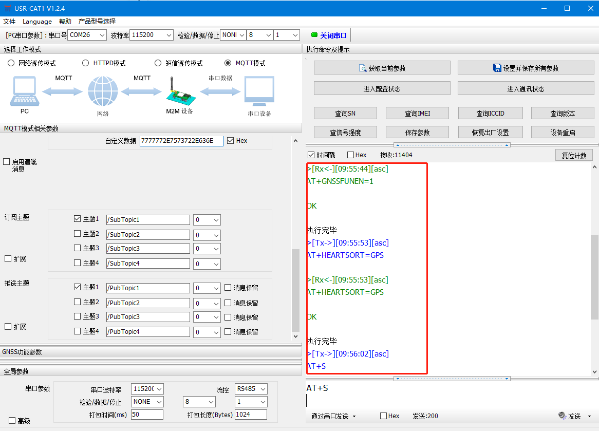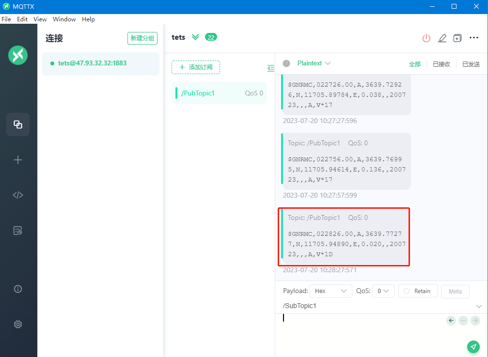 設備鏈接GPS天線可以防在室內空曠位置,在MQTT.X查看定位數據
