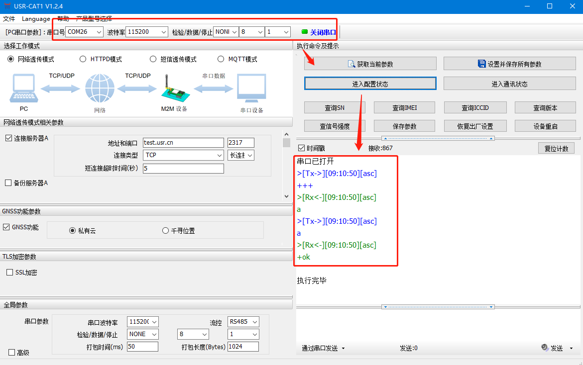 1.按照出廠默認的波特率(115200,N,8,1)打開電腦識別的COM口,點擊進入配置狀態,獲取參數。