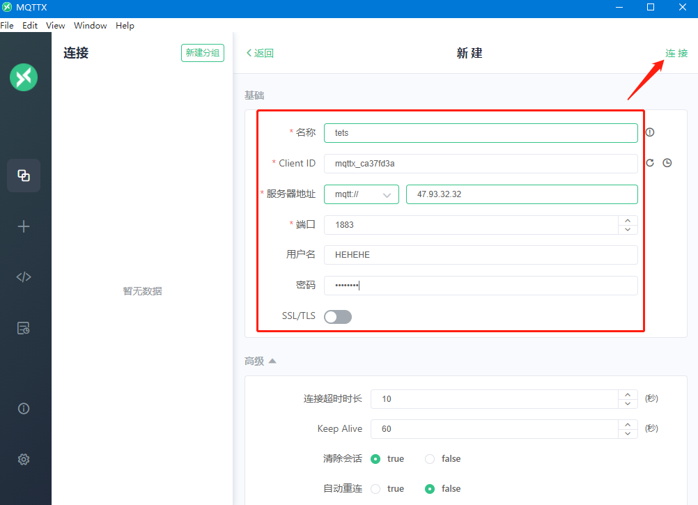 3.打開MQTT cleint軟件:MQTT.X,點擊新建一個客戶端,填寫好MQTT服務器參數后點擊"Connect”