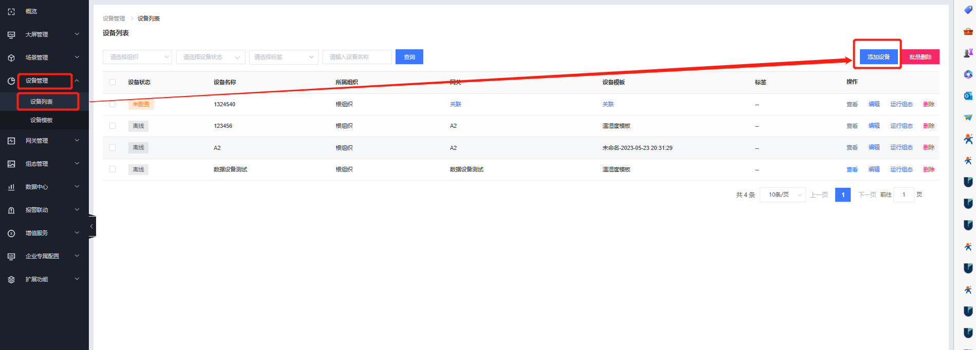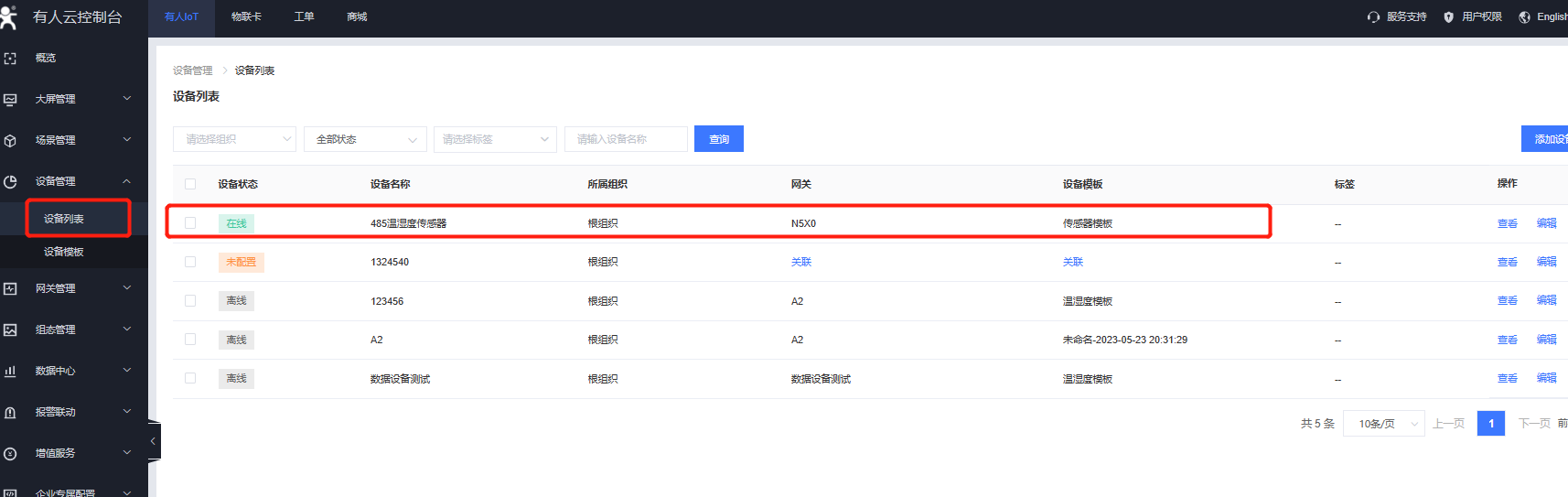 8、在設備列表信息展示界面,顯示關聯的網關與設備模板表示云端配置已完成。