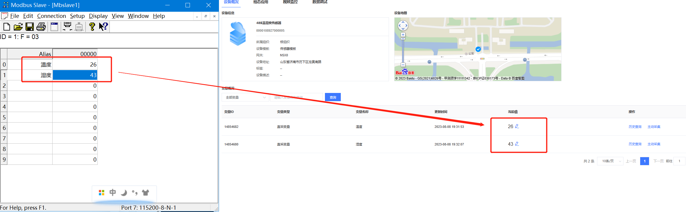 打開modbus slave軟件(模擬串口傳感器設備)配置串口設備的寄存器信息,調用電腦設備管理器中生成的com口,并設置好寄存器參數。最終賦予slave值,會發現云端成功采集到slave從機數據。