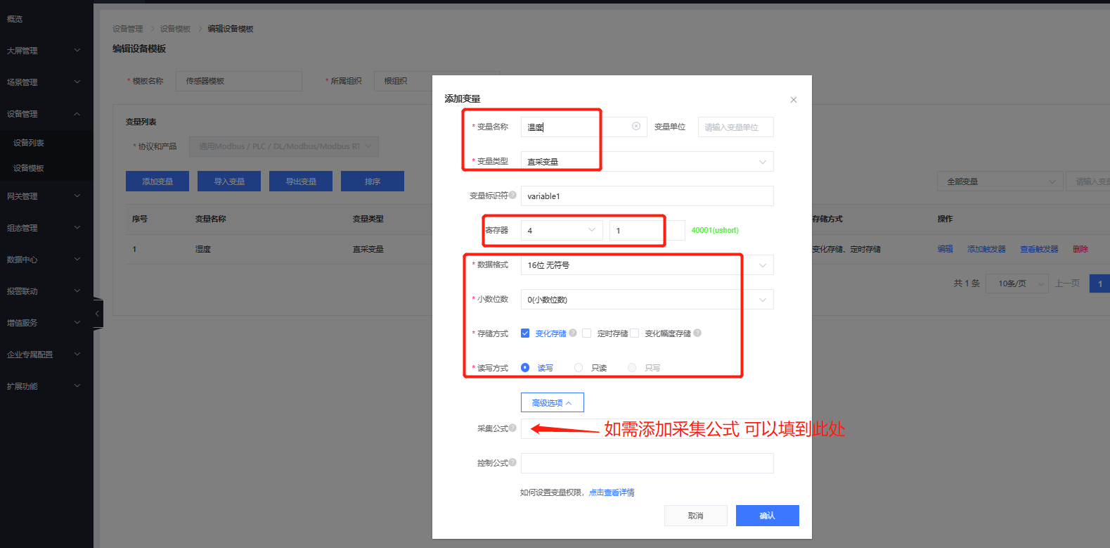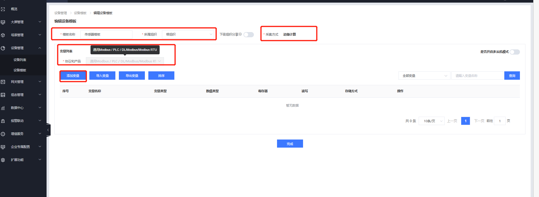 6、在設備管理---設備模板界面添加需要采集的從機變量點。寄存器信息需要與串口設備進行匹配。