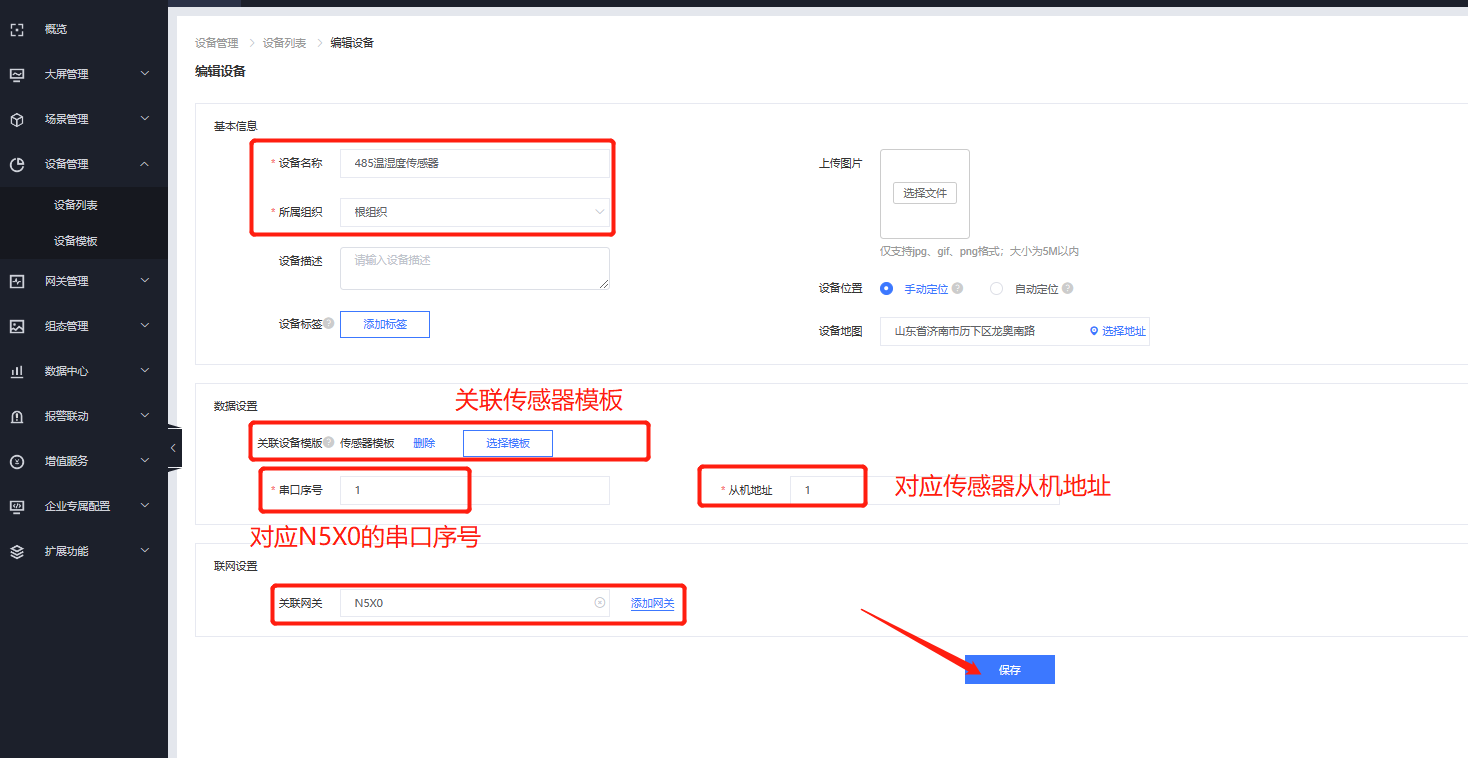 7、在設備管理--設備列表的界面添加一個設備,把設備模板進行關聯,并配置串口終端設備的從機地址。